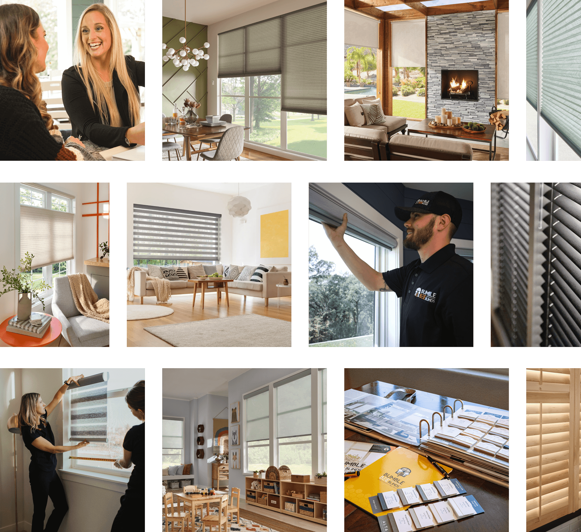 Do you have a showroom I can visit?Bumble Bee Blinds brings the showroom to you! Nothing beats seeing real world samples and colors in your actual home. Schedule a Design Consultation and we'll bring swatches, sample books, and our expert design consultant to guide you through your options and solutions that best fit your needs, all in the comfort of your home.