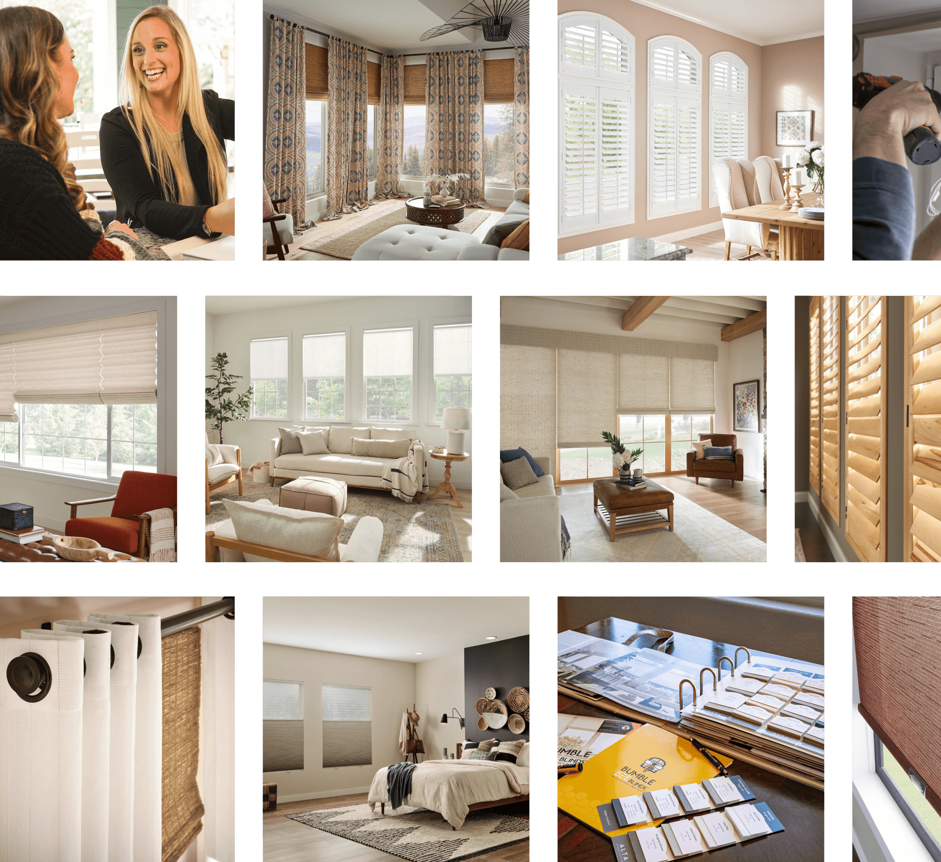 Do you have a showroom I can visit?Bumble Bee Blinds brings the showroom to you! Nothing beats seeing real world samples and colors in your actual home. Schedule a Design Consultation and we'll bring swatches, sample books, and our expert design consultant to guide you through your options and solutions that best fit your needs, all in the comfort of your home.