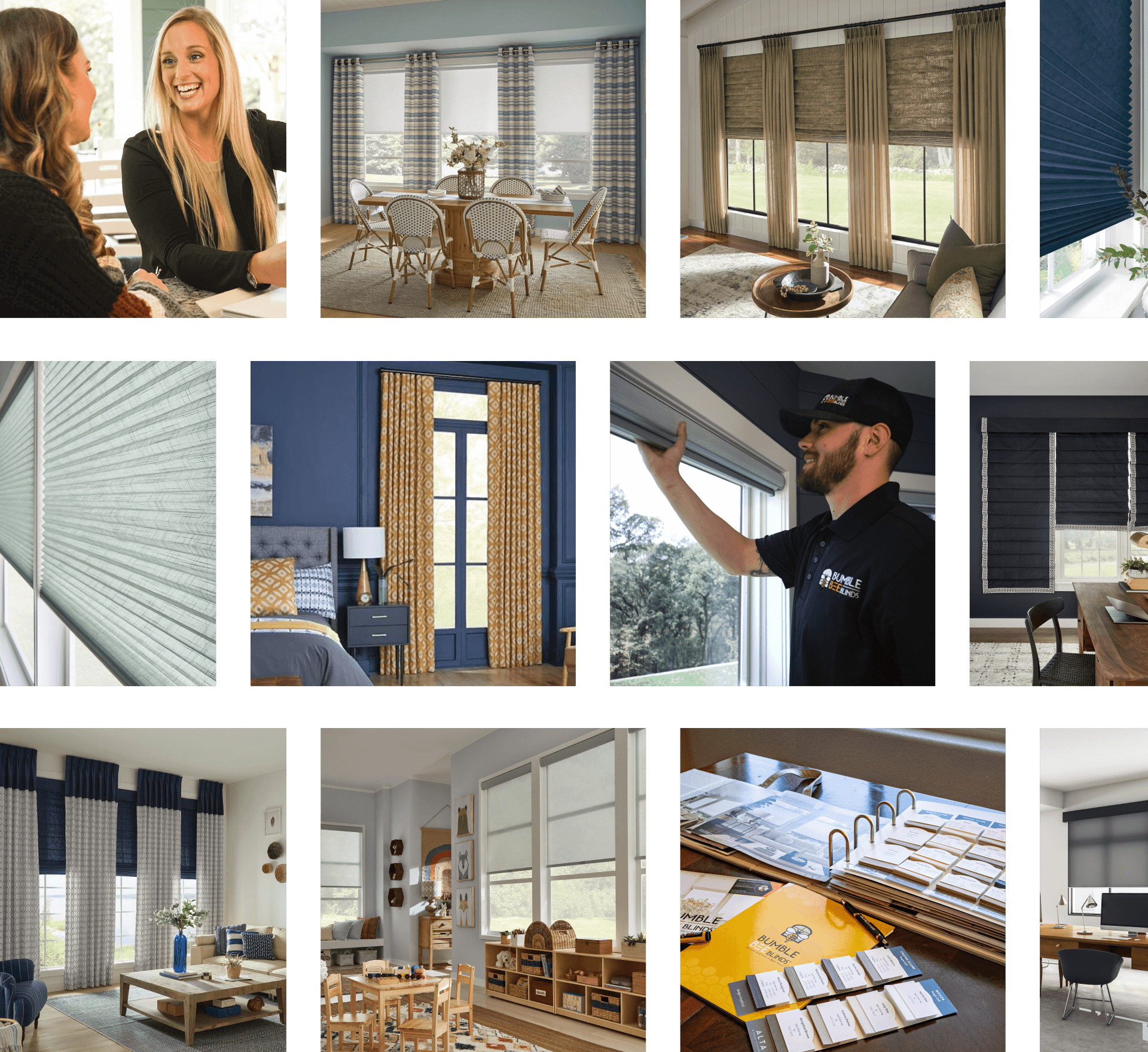 Do you have a showroom I can visit?Bumble Bee Blinds brings the showroom to you! Nothing beats seeing real world samples and colors in your actual home. Schedule a Design Consultation and we'll bring swatches, sample books, and our expert design consultant to guide you through your options and solutions that best fit your needs, all in the comfort of your home.